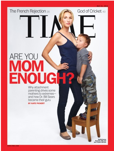 Calculo que a maior parte das poucas pessoas que lêem este blogue se hão-de chocar com esta imagem. Outras, as mães que, como eu, deram de mamar até aos 7 meses, hão-de sentir-se ultrajadas não com a foto mas com o título: "Are you mom enough"? Como se só fôssemos mães suficientemente boas se dermos de mamar até o puto entrar na escola.