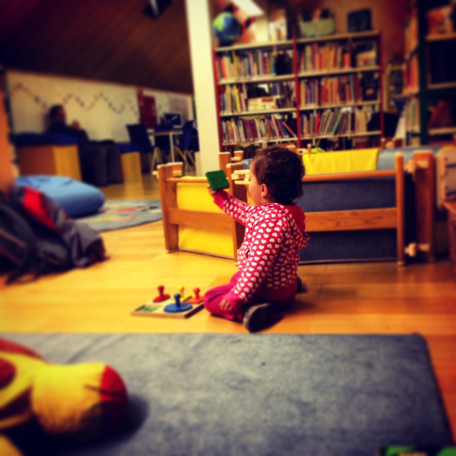 Como tal, lá fomos ontem experimentar a biblioteca municipal e, bom, ficámos todos rendidos. A secção infantil é enorme e está muito bem apetrechada. Até eu fiquei fascinada com tantos livros e cantinhos aconchegantes de leitura, jogos, equipamento de pintura (que ela, felizmente, não viu...), puzzles, bonecos, enfim, um autêntico delírio. E grátis!